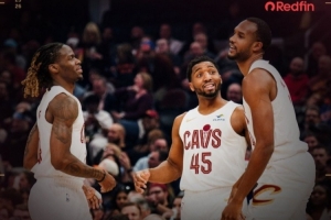 赛后球队官方发布赢球海报,封面为米切尔、莫布里和埃利斯。