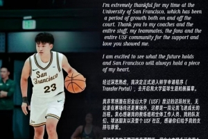赵维伦发文写道:“经过深思熟虑,我决定正式进入转学申请程序(Transfer Portal),去开启我大学篮球生涯的新篇章。我非常感激在旧金山大学(USF)度过的这段时光,无论是在赛场内还是赛场外,这都是一段让我飞速成长的历程,衷心感谢我的教练组和全体工作人员、我的队友们、球迷朋友以及整个USF社区,感谢你们给予我的支持和厚爱。